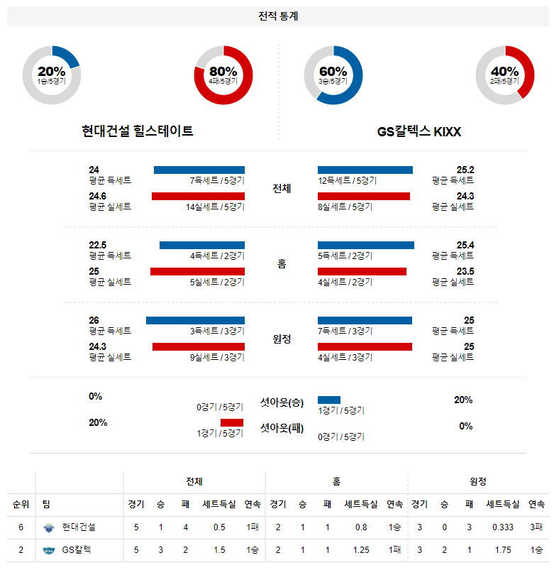올시즌 상대전에서 서로의 홈경기를 승리로 가져가면서 2승2패의 결과가 나왔다는 것을 주목해야 한다. 또한, 직전경기 팀은 패배를 당했지만 GS칼테스와 경기에서 승리를 기록할 당시 좋은 모습을 보였던 양효진과 정지윤의 경기력은 만족할수 있었던 상황.