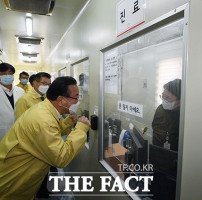 김부겸 국무총리가 31일 오전 서울 신내동 서울의료원에 마련된 '코로나19 재택 외래진료센터'를 방문해 의료진을 격려하고 있다./임영무 기자[더팩트ㅣ임영무 기자] 김부겸 국무총리가 31일 오전 서울 신내동 서울의료원에 마련된 '코로나19 재택 외래진료센터'를 찾아 현장 점검을 하고 있다.서울의료원 코로나19 재택 외래진료…