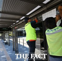 [더팩트ㅣ이새롬 기자] 서울 당산역 북측 올림픽대로와 노들로 사이에 위치한 당산역 광역환승센터가 운영을 하루 앞둔 30일 관계자들이 정류소에 안내 스티커를 부착하고 있다.서울시는 오는 31일부터 당산역에 광역버스 전용 '광역환승센터'를 운영한다고 밝혔다. 노선환승센터에는 총 9개 광역버스 노선이 동시에 정차할 수 있다. …