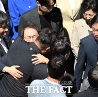 [더팩트ㅣ이새롬 기자] 전교조 해직교사를 부당하게 특별채용한 혐의로 재판에 넘겨진 조희연 서울시교육감이 집행유예가 확정된 가운데, 29일 서울시교육청사를 나서며 곽상언 더불어민주당 의원과 포옹하고 있다.조 교육감은 "누구나 살면서 몇번쯤은 고난을 두려워하지 않고 정의로운 가치에 몸을 던져야 할 때가 있다고 생각한다. 해직…