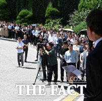 [더팩트ㅣ이새롬 기자] 전교조 해직교사를 부당하게 특별채용한 혐의로 대법원에서 집행유예가 확정된 조희연 서울시교육감이 29일 서울시교육청사 앞에서 청사를 나서며 입장을 밝히는 가운데, 많은 교육청 직원들이 도열해 있다.조 교육감은 "누구나 살면서 몇번쯤은 고난을 두려워하지 않고 정의로운 가치에 몸을 던져야 할 때가 있다고…