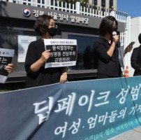 전국여성연대와 서울여성연대 회원들이 30일 정부 서울청사 앞에서 '딥페이크 성범죄를 규탄하는 여성· 엄마들의 기자회견'을 열고 강력한 처벌과 종합 대책 수립을 촉구했다.
