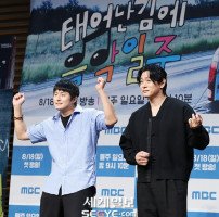 방송인 기안84(사진 왼쪽)와 배유 유태오가 16일 오후 서울 마포구 상암 MBC에서 열린 MBC 새 예능 '태어난 김에 음악일주'의 제작발표회에 참석해 포즈를 취하고 있다. '태어난 김에 음악일주'는 기안84가 버킷리스트 중 하나였던 가수의 꿈을 향해 나아가는 여정을 담은 프로그램이다. 한윤종 기자 hyj0709@seg…