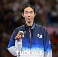 태권도 57kg급, 16년 만에 금메달 쾌거 세계랭킹 24위 김유진, 상위 랭킹 격파하며 결승 올라와금메달을 확정한 김유진이 8일(현지시각) 프랑스 파리 그랑 팔레에서 열린 2024 파리 올림픽 태권도 여자 57kg급 시상식에서 시상대에 올라 기뻐하고 있다. /파리=뉴시스[더팩트ㅣ김샛별 기자] 한국 태권도 김유진(23?울…