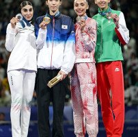 대한민국 태권도 국가대표 김유진(왼쪽 둘째)이 9일(한국 시간) 프랑스 파리 그랑팔레에서 열린 2024 파리올림픽 태권도 여자 57㎏급 결승전에서 세계 2위 이란의 나히드 키야니찬데를 꺾고 금메달을 따낸 뒤 다른 메달리스트들과 함께 기념촬영을 하고 있다. 왼쪽부터 은메달 나히드 키야니찬데(이란), 금메달 김유진, 동메달 …