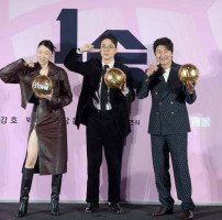 배우 장윤주, 박정민, 송강호(왼쪽부터)가 28일 CGV 용산점에서 열린 영화'1승(감독 신연식)' 제작발표회에서 포즈를 취하고 있다. 영화'1승(감독 신연식)'은 이겨본 적이 없는 감독과 이길 생각이 없는 구단주, 이기는 법을 모르는 선수들까지 승리의 가능성이 1도 없는 여자배구단이 1승을 위해 도전에 나서는 과정을 다…