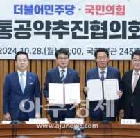 [사진=유대길 기자 dbeorlf123@ajunews.com]박성준 더불어민주당 원내수석부대표(왼쪽부터)와 진성준 정책위의장, 김상훈 국민의힘 정책위의장, 배준영 원내수석부대표가 28일 오전 서울 여의도 국회에서 열린 민생·공통공약추진협의회 출범식에서 합의문을 들고 기념촬영을 하고 있다. 2024.10.28 아주경제=유대…